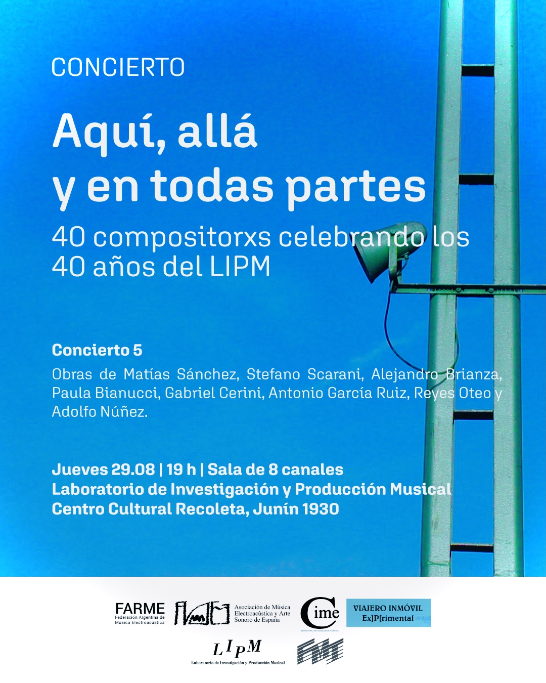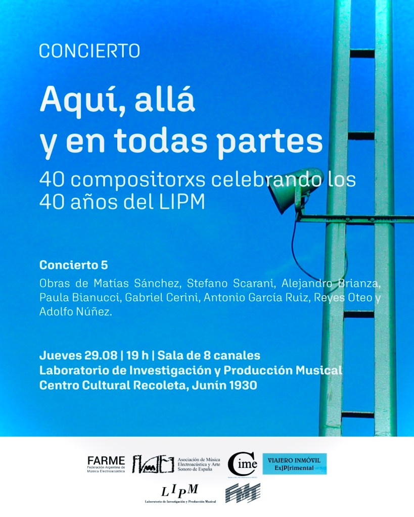 El próximo jueves 29 de agosto a las 19hs tendrá lugar el 5to encuentro del ciclo de conciertos Aquí, allá y en todas partes, dedicados a la difusión de música acusmática y mixta de Argentina y del mundo celebrando los 40 años de historia del Laboratorio de Investigación y Producción Musical [LIPM] del Centro Cultural Recoleta, con curaduría y organización Jorge Sad Levi en colaboración con Javier Leichman, el director del propio LIPM.